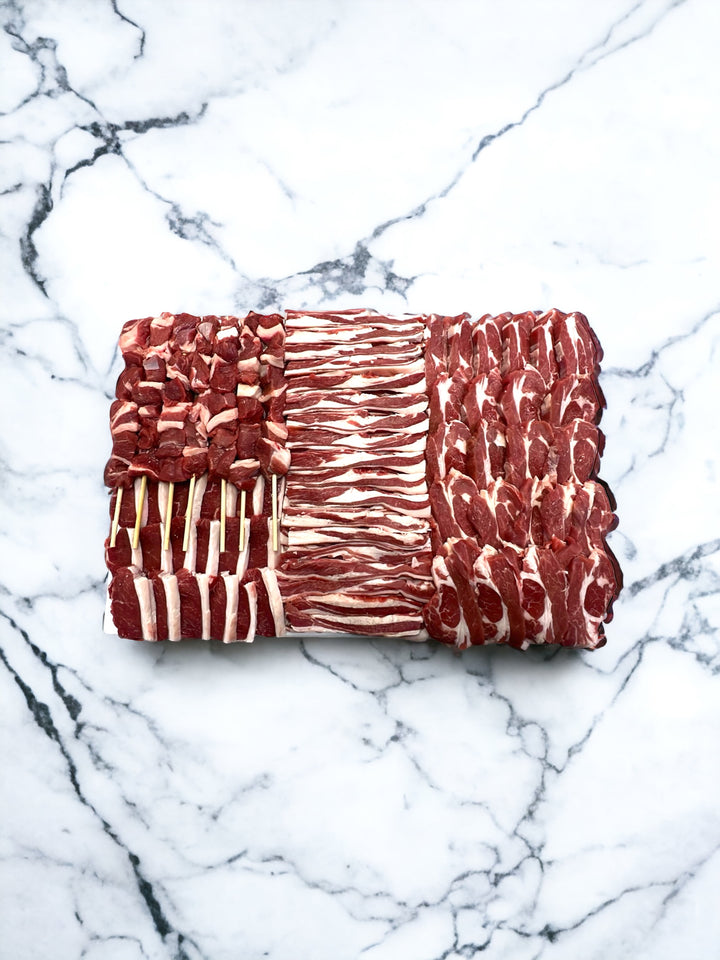 Our platter of the finest cuts of meat offers a diverse selection of cuts to cater to different preferences and cooking styles. It includes a combination of succulent lamb skewers, sliced neck fillet, shoulder strips , lamb backstrap .This variety ensures there's something for everyone to enjoy.