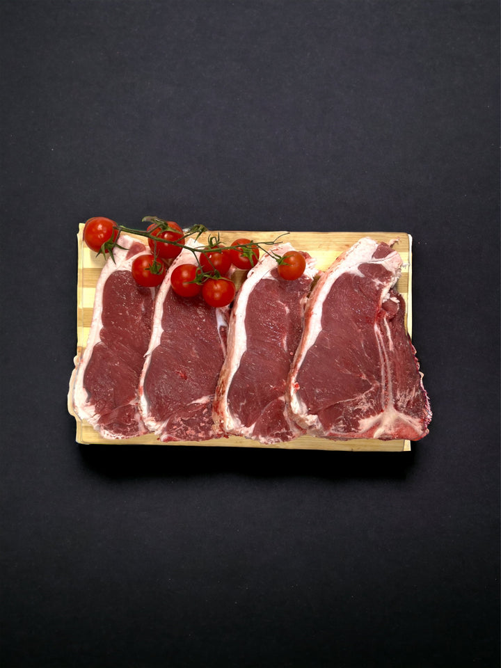 T-bone steak is a beef steak that is cut from the short loin of the cow. It gets its name from the T-shaped bone that separates the two different sections of meat, the tenderloin and the strip steak. The tenderloin is known for its tenderness and mild flavour, while the strip steak is known for its rich, beefy flavour. T-bone steaks are often grilled, broiled or pan-fried, and they are a popular steakhouse menu item due to their flavour and tenderness. The thickness of the T-bone steak can vary, but a typical cut is around one inch thick.